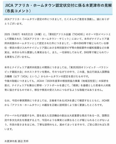 現地の報道等の「JICAアフリカ・ホームタウン」のもとで山形県長井市がタンザニアの国の一部になると誤解を与えるような記載や、移民の受け入れ促進、日本と当該諸国との往来のための特別な査証の発給等の記載は、いずれも事実に反します。