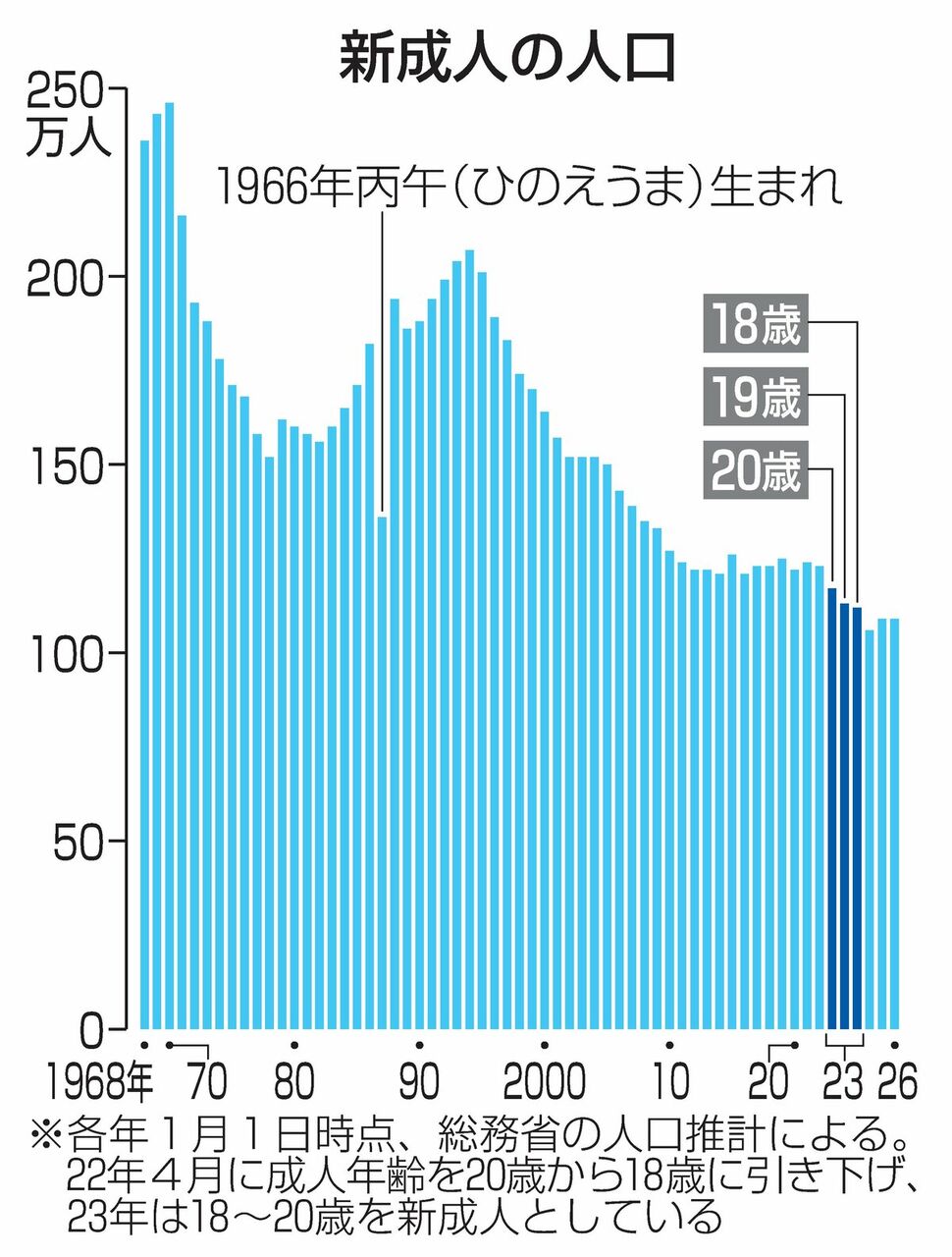 前回の丙午である1966年(昭和41年)は迷信の影響が顕著で、出生数約136万人(出生率1.58)で、前年の出生数約182万人(出生率2.14)に比べて約25%減少しました。翌年、1967年の出生数が約193万人(出生率2.23)に回復していることから、子どもを考えていた夫婦が丙午の出産を避けたことが分かります。