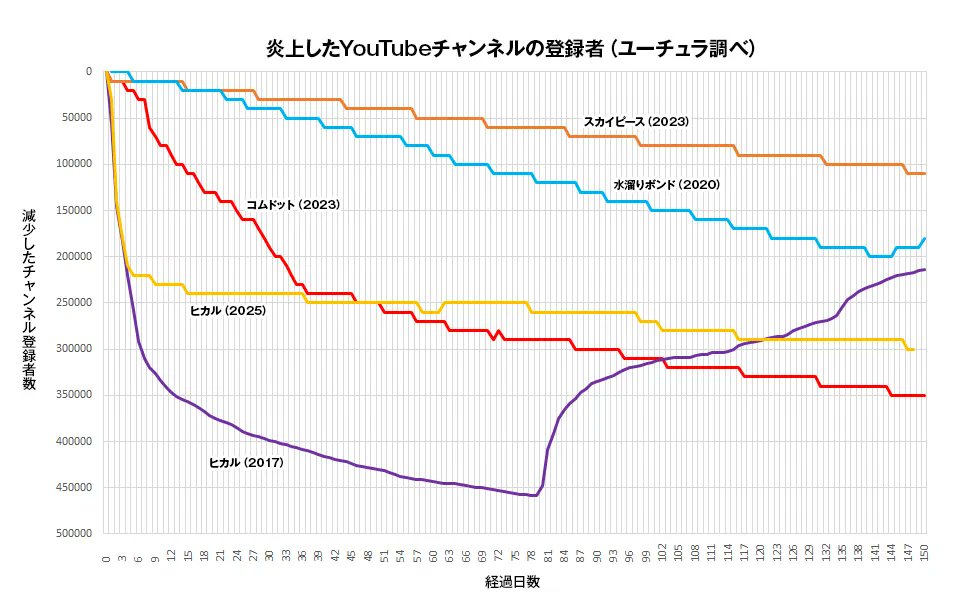 以下のグラフは、炎上日を起点に150日後までの登録者の減少数を、他のYouTuberと比較したものです。