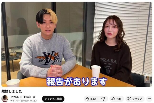 ヒカルは2025年5月、元カリスマキャバ嬢で実業家の「進撃のノア」(登録者数98万人)との“0日婚”を発表しました。しかし、同年9月に“オープン・マリッジ”を宣言すると、視聴者からの批判が殺到して大炎上。それまで507万人いたチャンネル登録者は、わずか1日で12万人も減少する状況となりました。
